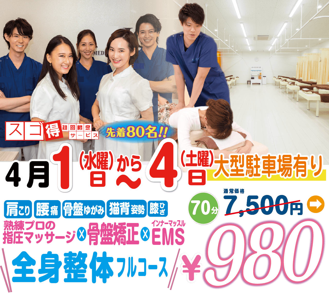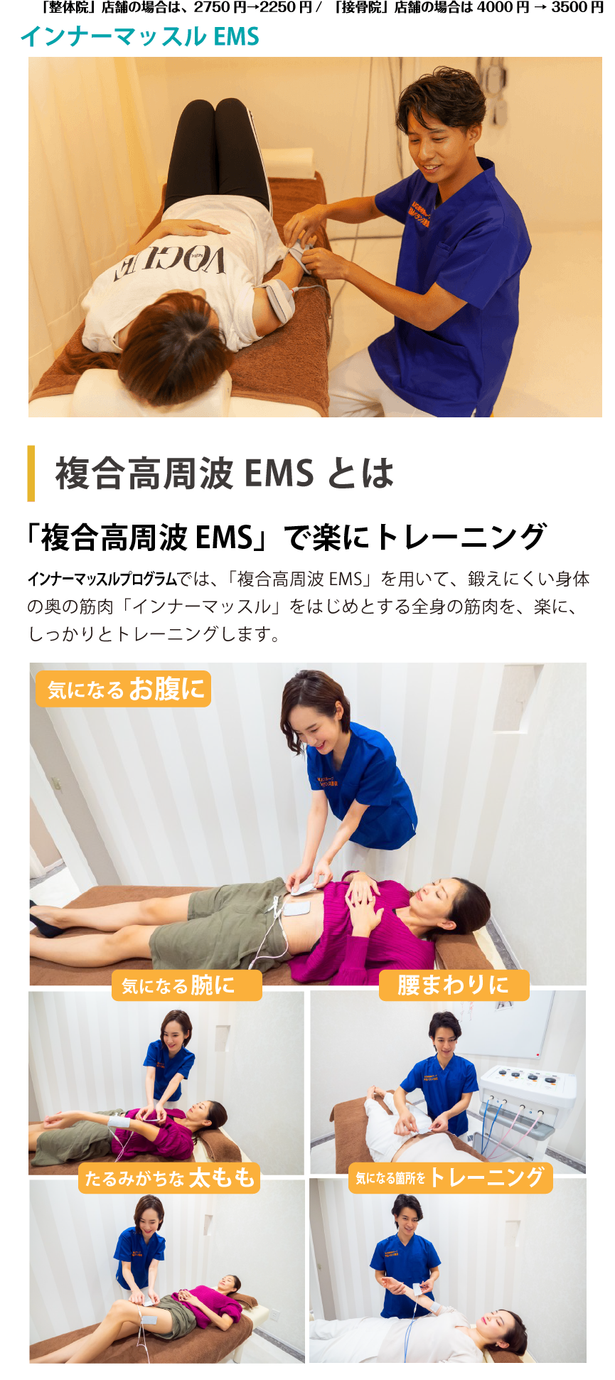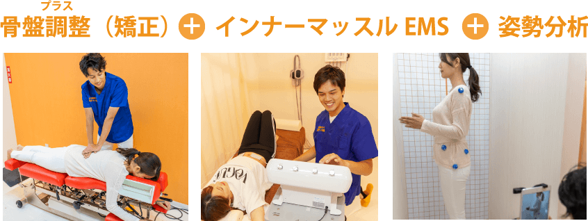 骨盤調整+複合高周波EMS。骨盤&複合高周波EMSメニューで辛さをしっかり緩和しインナーマッスル(深層筋)を鍛えることで「辛さの出にくい体作り」を目指します。美しい姿勢の維持にも。