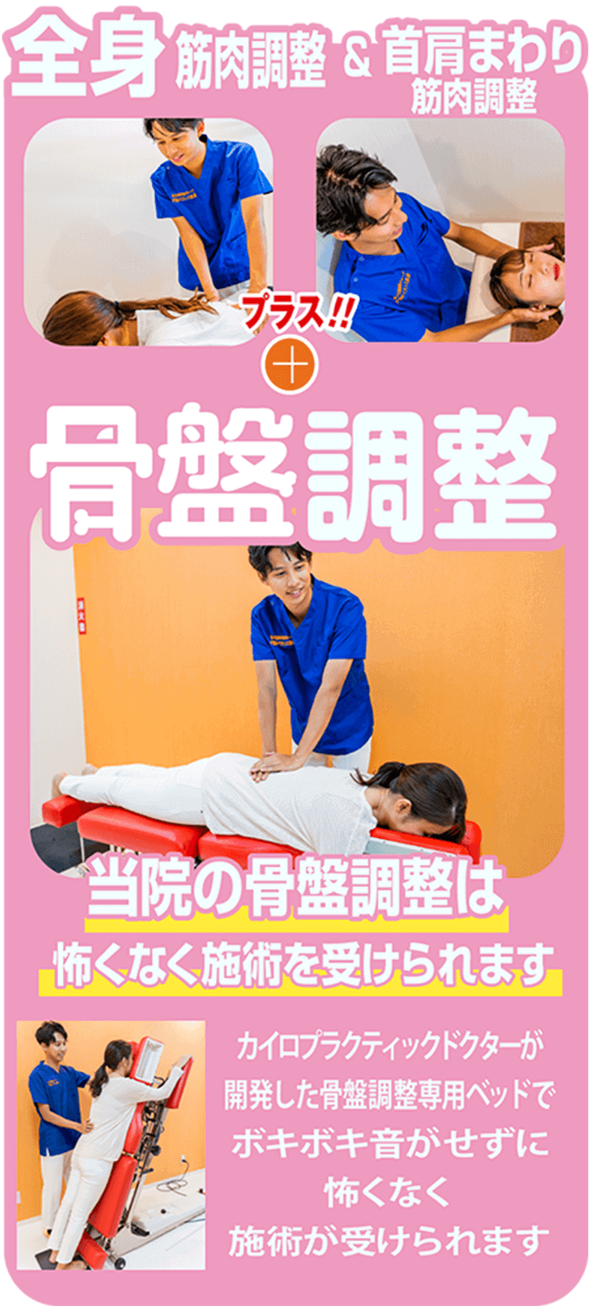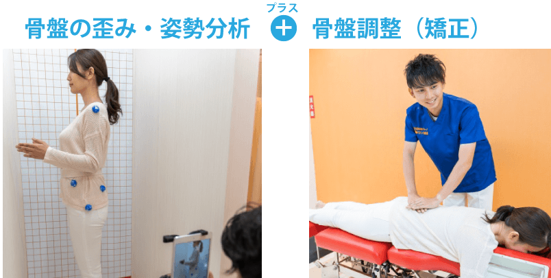 骨盤調整(調整)で骨盤の歪みを正し体のバランスを整え辛さのある部位への負荷を緩和します。